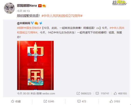 台灣網10月1日訊 10月1日淩晨,包括歐陽娜娜、王大陸在內的多位臺灣藝人在微博公開發聲,祝福祖國繁榮昌盛,獲大陸網友點讚。