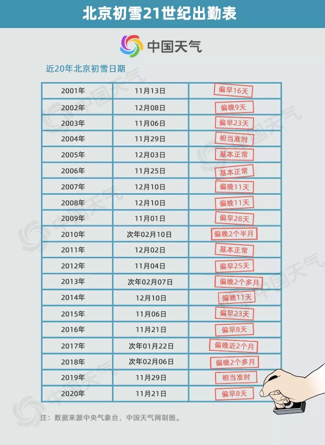 常年北京的初雪時間為11月29日,今年冬天,它提前了23天,但從21世紀以來的初雪時間表上來看,今年還不算最早的。初雪最早在2009年11月1日就“現身”京城;2010年冬季,初雪在次年的2月10日才姍姍來遲。