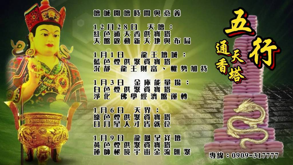 2021年5月份開始的第一階段108天『龍王法會』順利圓滿,令龍天法喜、諸佛讚言,許多參與的大眾共沐法雨、冥陽兩利;第二階段『龍華祈福聖會』,希望在111年1月1日「11111」這代表美好、創新的元旦開始,能夠引渡更多的普羅大眾也有機會跟龍族結善緣,提升靈性與功德,藉由參與法事、竭誠盡心供養,利益普及所有龍族,也能利益我們人和收圓、具有源源不絕的創新靈感、累積財富能量、圓滿布施波羅蜜。