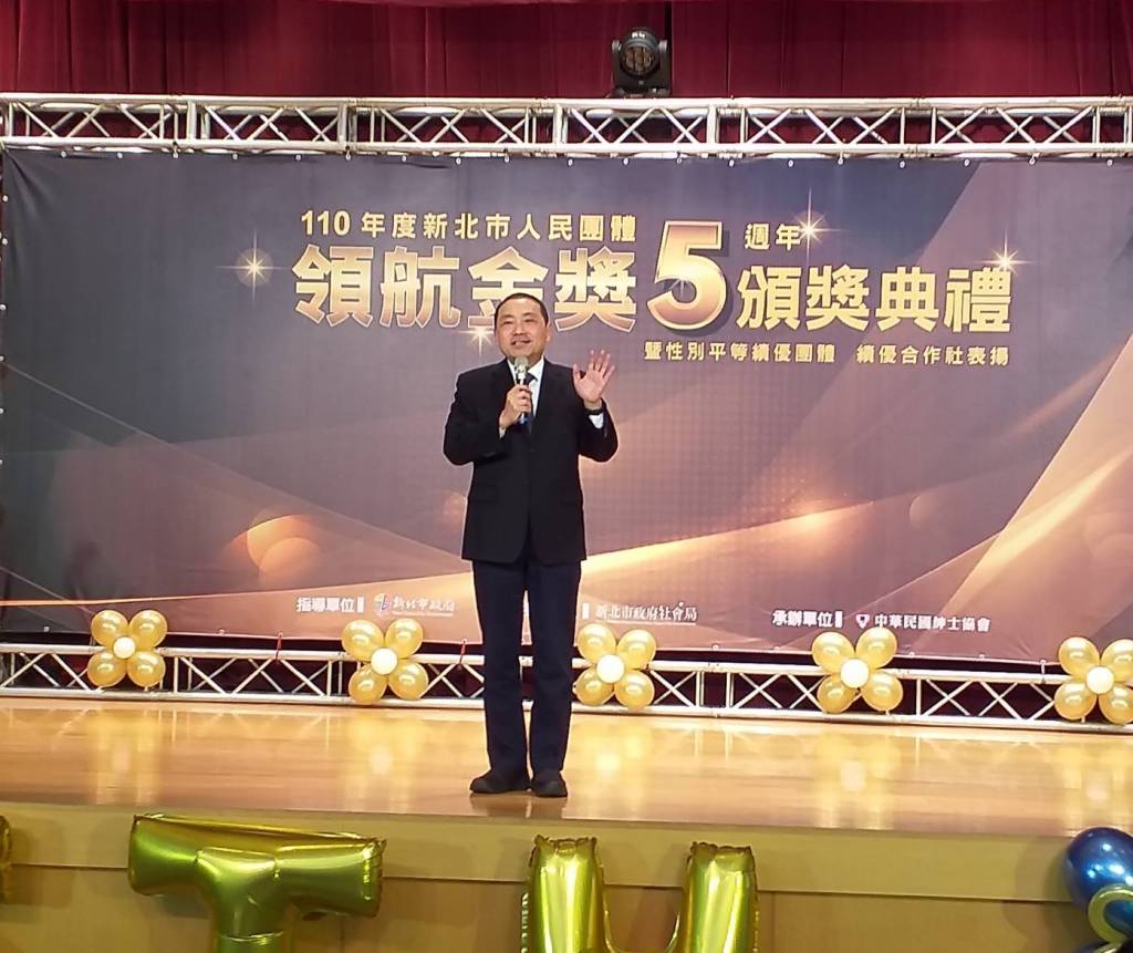 新北市長候友宜親為人民團體「領航金獎」表彰積極服務社會表達敬佩。