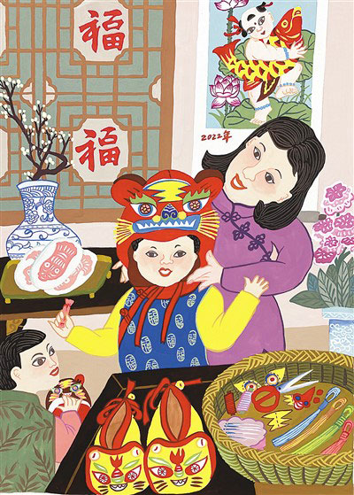 “虎”在民間美術中的表現形式豐富,有刺繡、版畫、剪紙、泥塑等,應用於玩具、服飾、傢具等日常用品,出現在日常起居、歲時風俗、人生禮儀等生活場景。為何“虎”在民間如此受歡迎?大概源於遠古留下來的圖騰崇拜以及世世代代紮根於民眾內心的吉祥觀念:辟邪、鎮宅、佑福。遠古時期的虎圖騰,是把“虎”形象放在神聖的位置,追求“虎神佑我”,而民間美術中的“虎”形象則是為我所用,是物化了的“為我服務”的審美心態,體現著人民群眾對生命的頌揚,對幸福的追求和對美好生活的嚮往。
