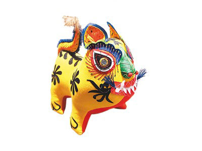 山西吉祥虎枕(也可作為玩具),為意象化的猛虎造型。其造型元素與民間虎頭鞋、虎頭帽樣式如出一轍。虎呈站立姿態,鼻子造型中融入了艾草葉造型。民間觀念中,老虎是百獸之王,人們常用艾草製成老虎的形狀來驅除疾病,而艾草本身也可治百病,相當於百草之王。虎眼、虎牙、虎耳、虎尾皆用拼裝化構件組合而成,身軀上亦分佈有花型毛旋,形成吉祥喜慶的裝飾風格,與年畫之虎相比多了一份稚拙與可愛。布虎多是母親為孩子所做,體現了中國婦女的心靈手巧和聰明才智。一針針、一線線的縫製,都融入了滿腔的愛意。