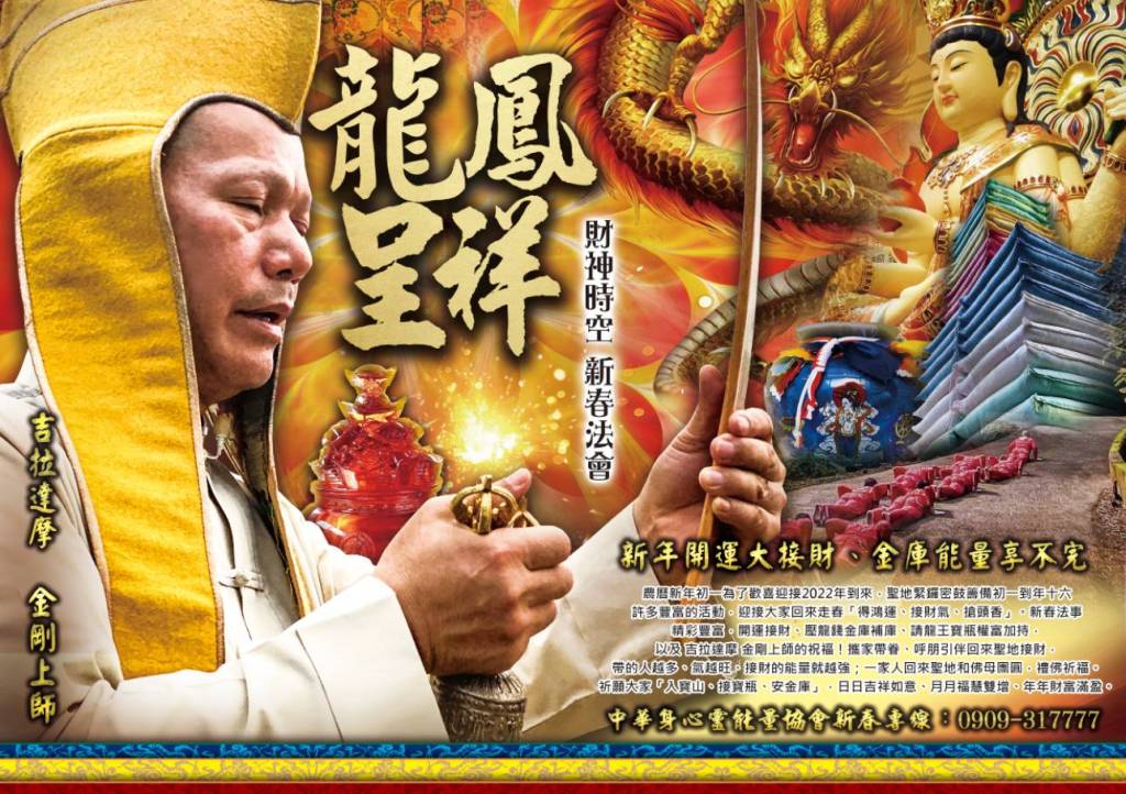 吉拉達摩 金剛上師早於20年前,得知現今地球人類將遇之危機,遵循蓮師財神感召,到西藏桑耶寺請領龍王煙供香與大禮拜旨令回台灣,誠心供養法界龍王煙供香,用珍貴煙供法藥修復天地萬物靈性,長年24小時不間斷供養,感動天地,得以機緣分別先在泰國聖河、台灣海峽安置上千個龍王寶瓶,奠定長達108天「蟠龍聚寶陣地磁 富貴吉祥法會」的基石、勾招世界各地的龍族回到「佛母孔雀明王修行園區」接受大量供養與療癒;並於法會圓滿後,將各法脈祝福的成千個龍王寶瓶,安置在靈山聖地,用「佛母孔雀明王大法」安龍謝土、供養靈地,祝願地球平安、世界和平、龍王早日成佛!