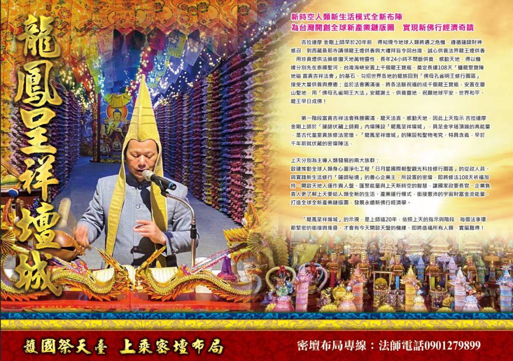 「龍鳳呈祥壇城」的示現,是上師這20年,依照上天的指示與階段,每場法事環環相扣與堆疊,今日才有開啟天盤,造福人類的機緣,實屬難得!