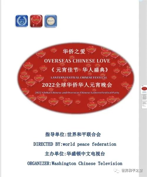 由世界和平聯合會指導,華盛頓中文電視臺主辦,媒體亞衛傳媒集團有限公司協辦的“元宵佳節 華人盛典”2022全球華僑華人元宵晚會。經過一個多月的籌備, 我們已十分榮幸的收到了中國駐三藩市總領館總領事、中國山西省僑聯主席、湖南省僑聯、長春市僑聯 、長沙市僑聯、邵陽市僑聯等視頻祝福和賀函祝賀,有十幾個國家加盟參與,並有多個國家的幾十位國際政要發來視頻和賀函祝賀。我們衷心地希望把這一中華傳統節日融中華文化,形成中華“文化的品牌”走向世界!