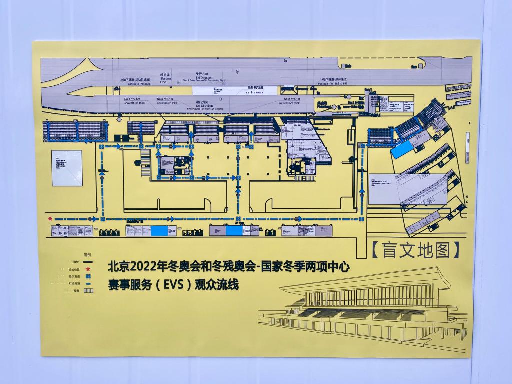 在張家口賽區國家冬季兩項中心,這裡將承辦殘奧越野滑雪、殘奧冬季兩項兩個大項的比賽。冬季兩項有視障組運動員參加比賽,場館準備了盲文閱讀材料、可觸摸式盲文地圖,為視障人士提供資訊無障礙服務,方便他們了解場館及競賽相關資訊。