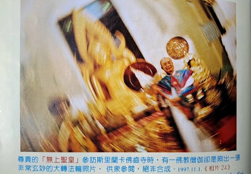 聖皇新天公林吉雄博士應邀在斯里蘭卡國家級的佛齒寺,他們的主管官,遵奉釋迦佛本駕旨意,將一支該國長扇贈送給貴賓的我,照片上的大圓圈滿佈,我們回國之後,才發現是不可思議的大顯化,而非模糊的相片。
