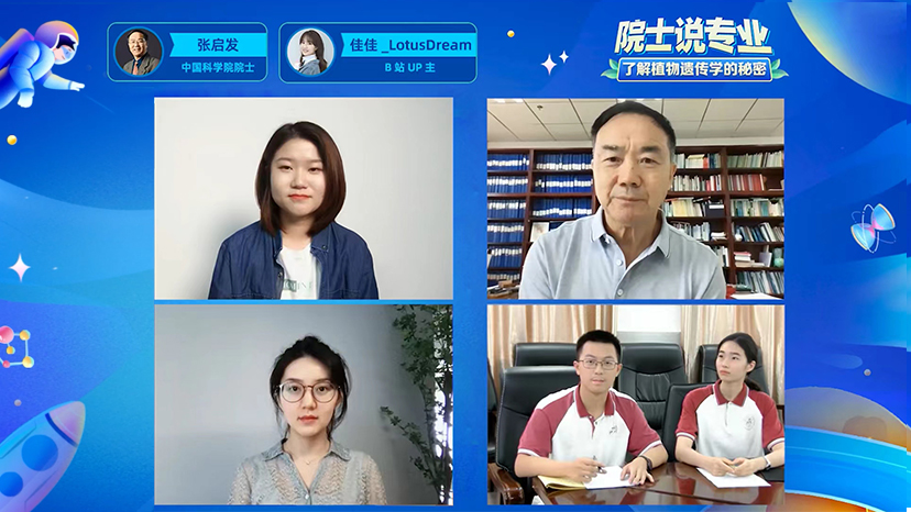 在“瞭解植物遺傳學的秘密”直播活動中,張啟發院士與B站UP主佳佳_LotusDream,以及張啟發院士母校湖北省荊州中學的學子們展開交流。