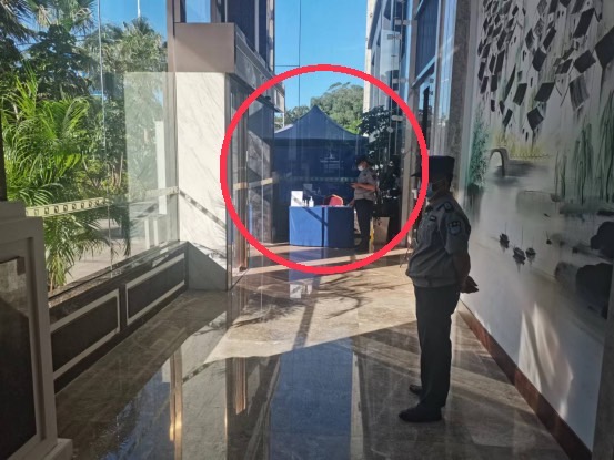 首先,酒店的兩個進出口各配備了兩名安保人員對酒店進出人員身份與核酸檢測資訊進行核驗,大廳還安排了幾位民警以防特殊情況發生。