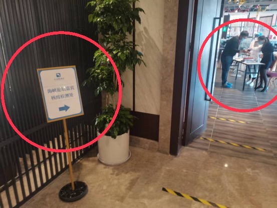酒店一樓有餐廳與核酸檢測處,記者朋友們外出回來都會要求做一次核酸檢測,(圖中在場的工作人員正在耐心的講解流程)核酸檢測的時間為每天早上9:00-12:00與下午15:00-18:00,全部免費並採取一人一管的檢測方式。