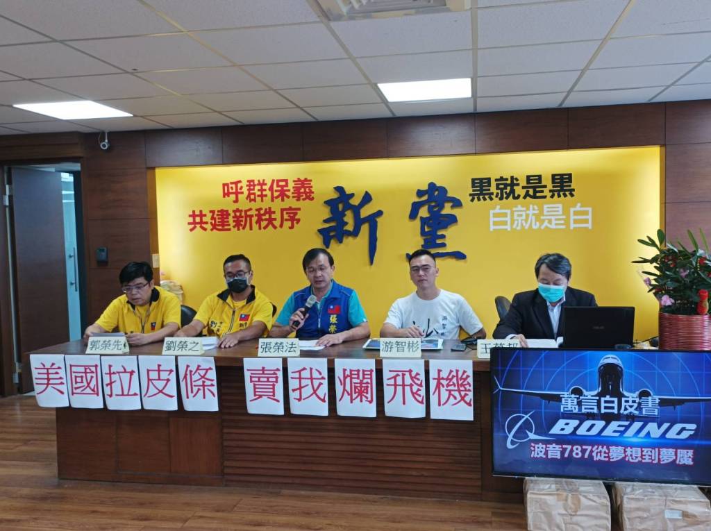 新黨市議員參選人等與大黃蜂團隊召開記者會表示,美國參眾議院已經變成皮條院,今年四月波音787尚未通過FAA檢測,就公然拉生意,請問美國人民,你們不覺得丟臉嗎? 新黨由大黃蜂團隊提出「波音787由夢想到夢魘」的萬字白皮書報告,要送交AIT,提醒美國政府,美國的偉大應該要有基本對人命尊重的良心。