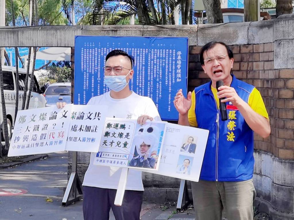 新黨台北市議員候選人張榮法,桃園市議員候選人游智彬等人聯合律師陳麗玲開記者會,昨(11)天公佈懸賞10萬新台幣現金尋找鄭文燦論文代寫槍手,呼籲若是中國大陸槍手自首也可以獲得人民幣2萬元。游智彬質疑鄭文燦論文極可能是大陸槍手代寫且指證歷歷,鄭文燦本人過了一周後仍一反常態低調,毫無回應。游智彬與張榮法到台大具名檢舉並被台大受理,接下來鄭文燦要面對的恐怕是台大學倫會的審查。