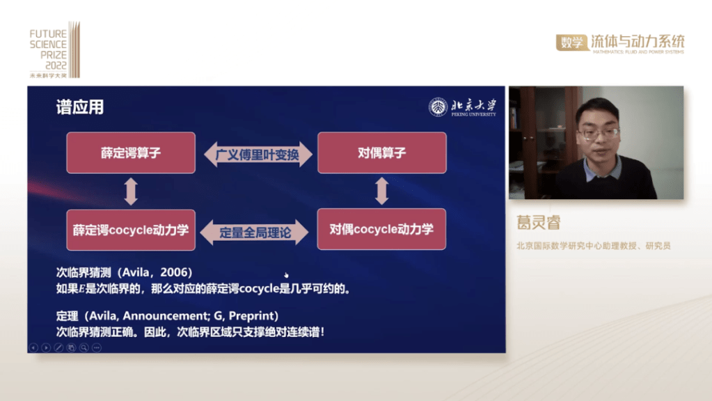 北京國際數學研究中心助理教授、研究員葛靈睿,進行了以《解析單頻薛定諤運算元的全域分析》為題的學術報告,介紹了擬週期薛定諤運算元譜理論,量子力學與薛定諤運算元譜理論的關係,以及如何用動力系統方法對譜理論進行研究。在演講中,葛靈睿對於解析單頻薛定諤運算元的全域分析進行探討,並展示了其與合作者在這一方面的相關工作。