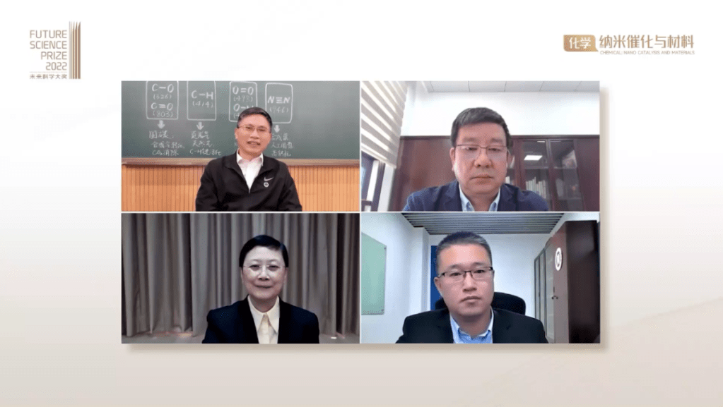 北京大學長聘教授、英國皇家化學會會士郭少軍主持本場活動的對話問答環節,李亞棟、趙東元、任詠華三位教授也在該環節中針對線上觀眾所提出的“單分子催化的工業應用”、“ 介孔材料在煤炭化工領域的應用前景”以及“新型催化劑活性和穩定性協同提升的設計準則”等問題進行了互動、探討與解答。