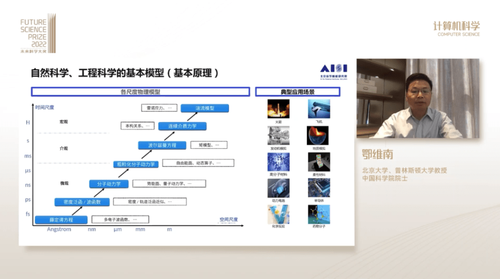 北京大學教授、普林斯頓大學教授、中國科學院院士鄂維南,以《演算法時代》為題進行了學術報告。他指出,隨著科學計算、大資料和人工智慧的發展,演算法已經成為推動科技創新和社會進步的核心工具。從科學研究的角度來看,機器學習與科學知識的有機結合,為科學和工程研究打開了前所未有的巨大空間。從技術創新的角度來看,人工智慧的進一步發展不僅將改變以製造業為代表的實體經濟,同時也將對社會治理和人們的日常生活帶來巨大改變。支撐這些新的發展空間的底層邏輯是演算法創新,可以說,人類正在邁入演算法時代。在演講中,鄂維南教授還探討了演算法創新研究給工業製造、人工智慧和科學研究等領域提供的新的發展機會和路徑。