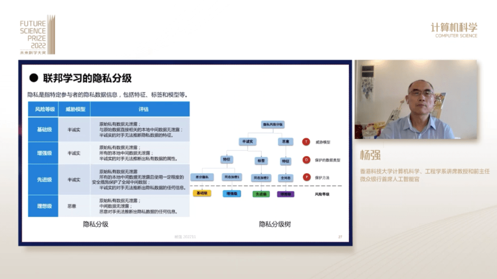 香港科技大學電腦科學和工程學系講席教授和前主任、微眾銀行首席人工智慧官楊強,在《可信聯邦學習》的學術報告中,以AI發展史為切入點,闡述了機器學習過度依賴中心化資料的問題。他指出,聯邦學習基於“資料可用不可見”思想,用於解決分散式、多源異構、極端隱私限制的建模問題,將人工智慧推向分散式2.0階段。可信聯邦學習范式具備安全可信、高效可用、決策可解釋、模型可監管,且普惠的特點。結合相關領域的研究熱點,楊強教授對領域發展做出展望。