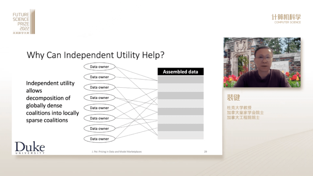 杜克大學教授、加拿大皇家學會院士、加拿大工程院院士裴健,以《資料市場定價》為題進行學術報告。裴健教授提出,完備的資料市場應當是動態的生態系統,各種應用可以從資料市場獲得資料,同時應用產生的新資料也能夠注入到資料市場中為別的應用系統所使用。資料市場定價的成本、利益以及供求關係是維護資料市場的公平、高效、規模化以及保障資料安全及隱私的重要因素。裴健教授結合資料市場定價涉及到的真實性、銷售最大化、公平性、隱私保護、計算效率等一系列問題進行分析,並指出後續研究方向。