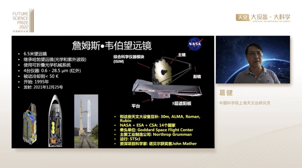 中國科學院上海天文臺研究員葛健教授,以《用詹姆斯•韋伯望遠鏡打開宇宙紅外寶藏》為題進行學術報告,介紹了詹姆斯•韋伯望遠鏡的概況和所獲得的初期科學成果。他指出,要研究宇宙在大爆炸後的早期歷史,需要在空間利用紅外波段進行細緻觀測,所以韋伯望遠鏡應運而生。與哈勃望遠鏡相比,韋伯望遠鏡具有更大的口徑和更深的觀測視場。利用韋伯望遠鏡,我們已經發現了之前從未觀測到的早期宇宙的星系和化學成分、銀河系中分子雲塊內部的恒星、恒星和行星的形成盤、熱星吹走塵埃之後留下的空洞等等令人驚奇的現象,除此以外可以利用紅外光譜儀研究行星的大氣成分等科學。未來韋伯望遠鏡也可以和中國目前在研的地球2.0科學衛星聯合研究宜居的類地行星和它們的大氣成分,以及探測上面的生命跡象。
