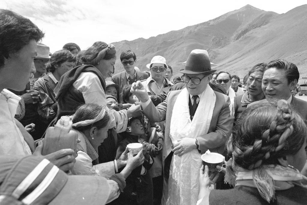 1990年7月25日,江澤民同志與藏族群眾共慶望果節。新華社發