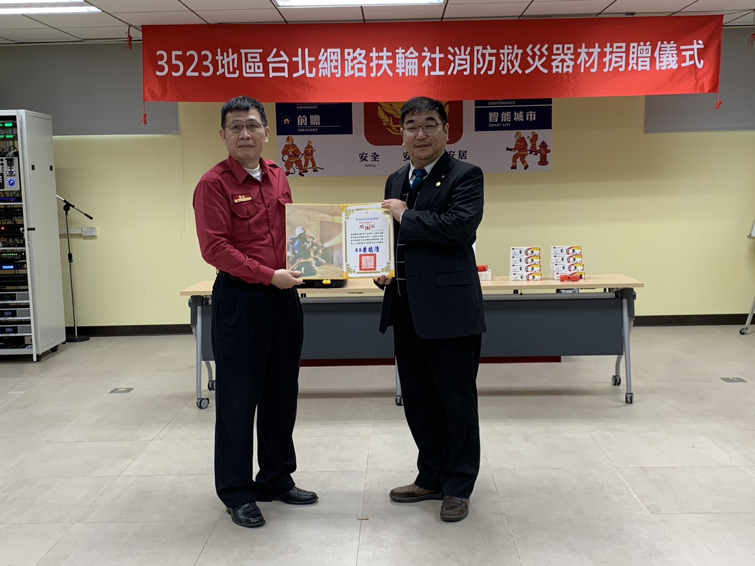 台北網路扶輪社秉持扶輪社『超我服務』的精神,以「寬容、親善與親手服務」的方向,並懷抱「取之於公眾,用之於公眾」的信念,於今(21)天上午在新北市政府消防局第七救災救護大隊,捐贈電動油壓撐開器1組與救災用頭燈24個,期望所捐贈之救災用器材,加入火災搶救勤務後,使民眾生命財產安全獲得更大保障。