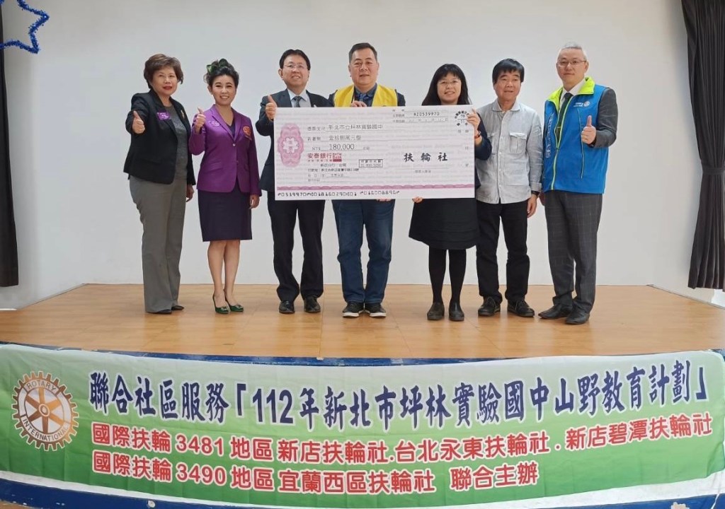 新店碧潭社唐宏輝社長身為新北坪林人,深感故鄕學子資源匱乏,今事業有成號召新店扶輪社,台北永東扶輪社及3490地區宜蘭西區扶輪社,聯合社區服務日前(元月11日) 捐贈180000元予坪林實驗國中協助落實[山野教育計劃]。