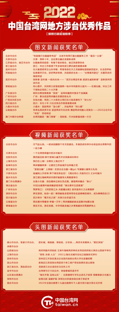 台灣網1月20日訊(記者 尹賽楠 黃曉迪)匯聚兩岸力量,共譜融合新篇。1月20日,由台灣網主辦的“2022年度地方涉臺優秀作品”推選活動結果正式揭曉。本次推選活動共設置優秀稿件、優秀視頻、優秀新聞圖片三大獎項,按照網友投票佔比20%、中科聞歌大數據傳播指數佔比30%及專家評審佔比50%的原則,最終確定了40件成功入圍的優秀作品。