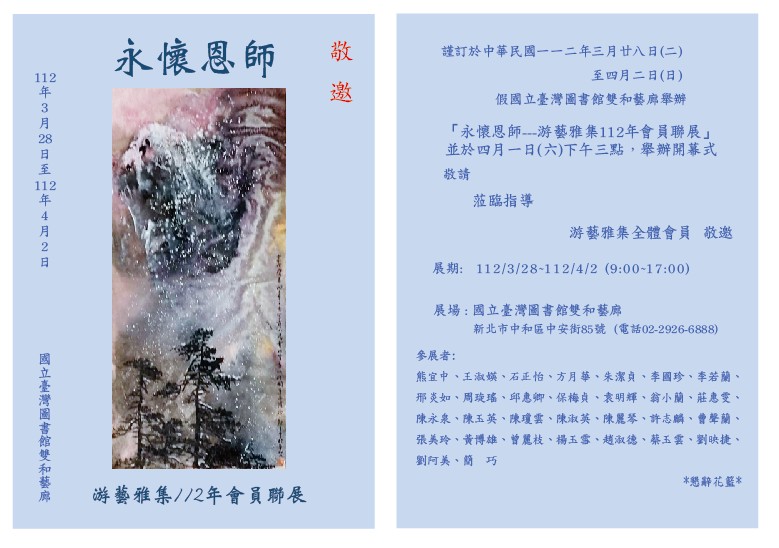 雖然熊老師已離開游藝雅集畫會學員,但他的畫魂永遠存在學員心中,學員們用他們作品繪畫來延續老師文人畫火種。
