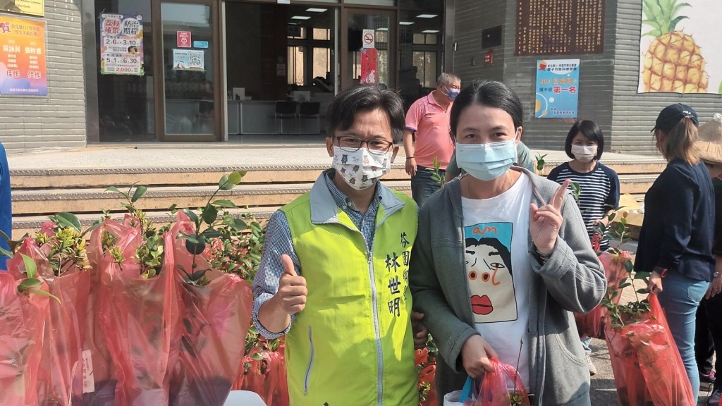 上圖,芬園鄉長林世明(左)贈送樹苗給鄉民 記者沈淑惠攝