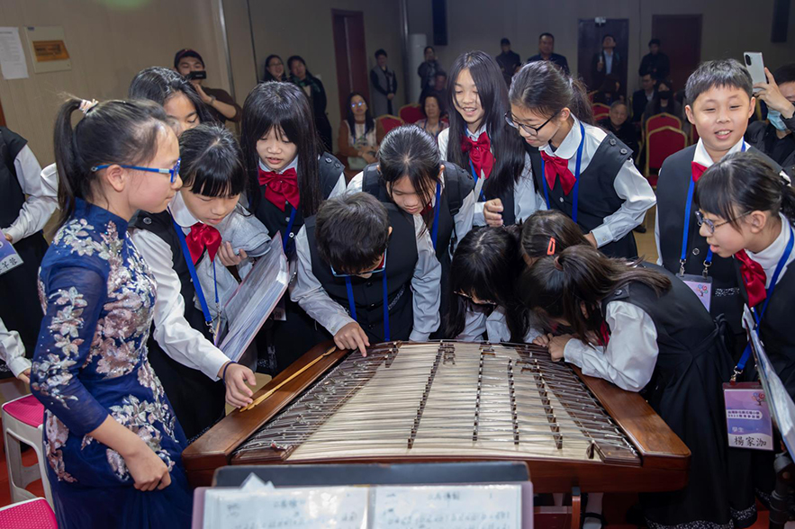江陰天華藝校鼓獅隊用歡快熱情的鼓獅舞歡迎花壇師生的到來,並表演了融匯非遺項目——九獅舞的特色舞蹈節目《雄獅少年》。舞蹈所表現的少年逐夢成長的故事深深感動了臺灣同學們。在天華藝校舞蹈老師的指導下,花壇小學16位同學舉起手獅,親身體驗九獅舞。天華老師們以《民樂與江陰》為主題分別講解了二胡、琵琶、阮、揚琴、古箏、竹笛、嗩吶、笙等中國民族樂器。來訪的臺灣同學以西洋管弦樂器見長,民樂豐富的種類、獨特的音色、優美的旋律使大家耳目一新。兩所都以藝術為特色的學校在交流中碰撞出燦爛的火花。