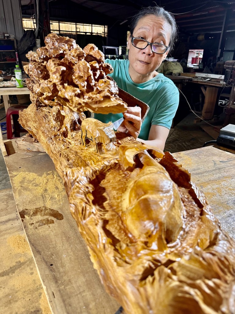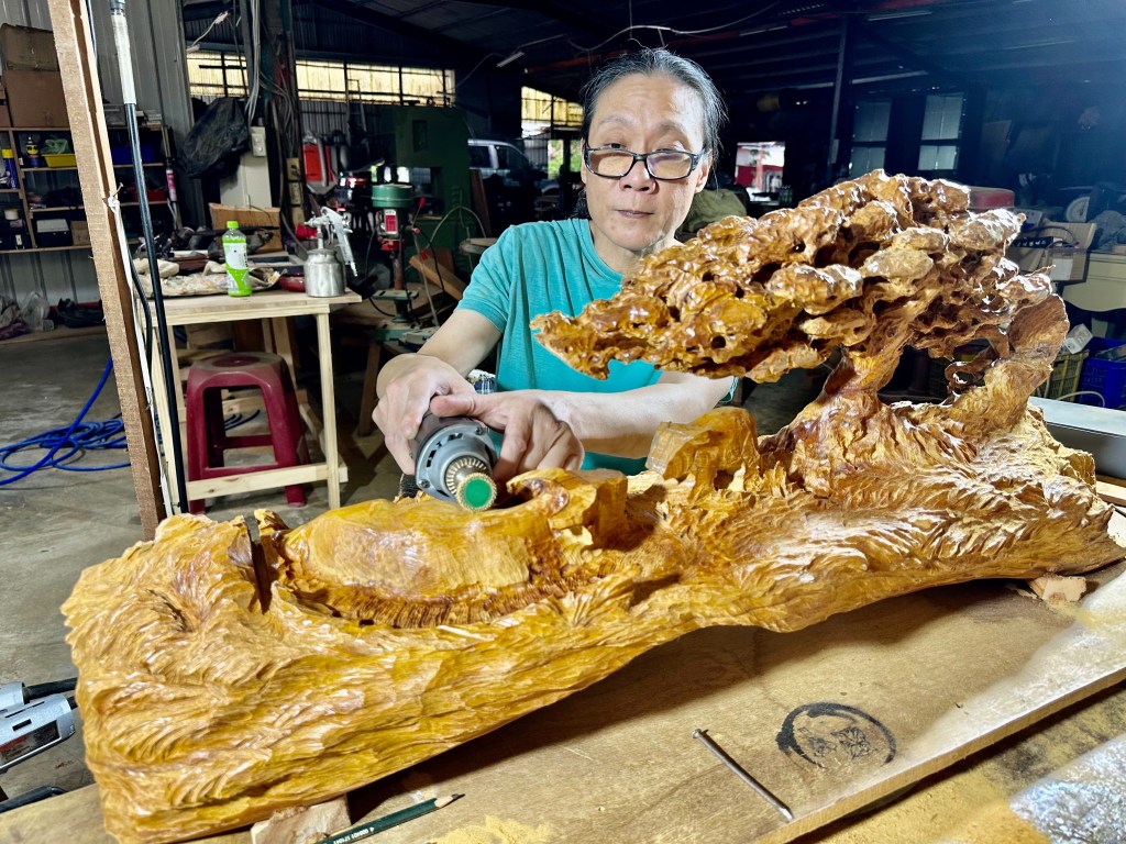 這件作品雕刻松樹的技術特別的艱難,尤其是肖楠木的油性材質比較容易讓工具粘黏在一起,施作不易。