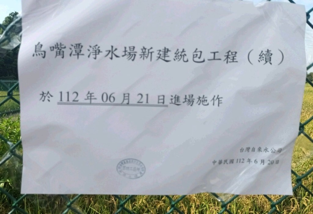 時到今天(6月22日),台中市政府尚未核定台水公司的「出流管制計畫書」,但台水公司卻急於想要進場施作,於6月20日,在鳥嘴潭淨水場四週圍籬張貼施作的告示(上图,沈淑惠攝影),並於6月21日,大批工程人員進場施作。