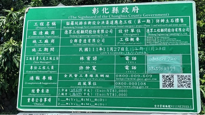 上圖,貓羅坑排水新設「分洪渠道」之施工告示牌 (記者 周信佑 攝)