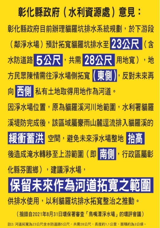 經濟部水利署於南投縣草屯鎮推動「鳥嘴潭人工湖工程計畫」,台灣自來水公司也規劃在鳥嘴潭下游設立「淨水場」,強化當地自來水供水系統。而台水鳥嘴潭淨水場預定地位於台中市烏日區的貓羅溪左側,原屬於豪雨山麓逕流排入貓羅溪之「緩衝蓄洪空間」,過去就經常發生水災,彰化縣政府此刻正在貓羅坑排水上游進行「分洪渠道」工程。建議台水公司在「分洪渠道」完工後,鳥嘴潭淨水場才進場施工,避免未來淨水場整地抬高後造成「淹水轉移」至上游範圍(即南側,行政區屬彰化縣芬園鄉)。