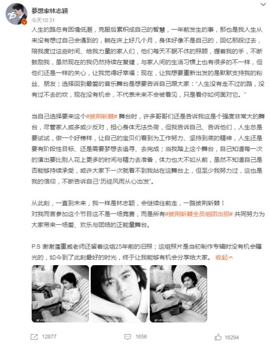 林志穎17日早在微博上發帖感言,談及去年車禍,他直言“那也是我人生從來沒有想過自己會遇到的”,並感謝了家人不眠不休的照顧和粉絲朋友們的支援。談及重回自己最愛的音樂舞臺,他説,是想要告訴大家“人生沒有走不過的路,沒有過不去的坎,現在沒有機會,不代表未來不會被看見,只是看你如何面對它。”