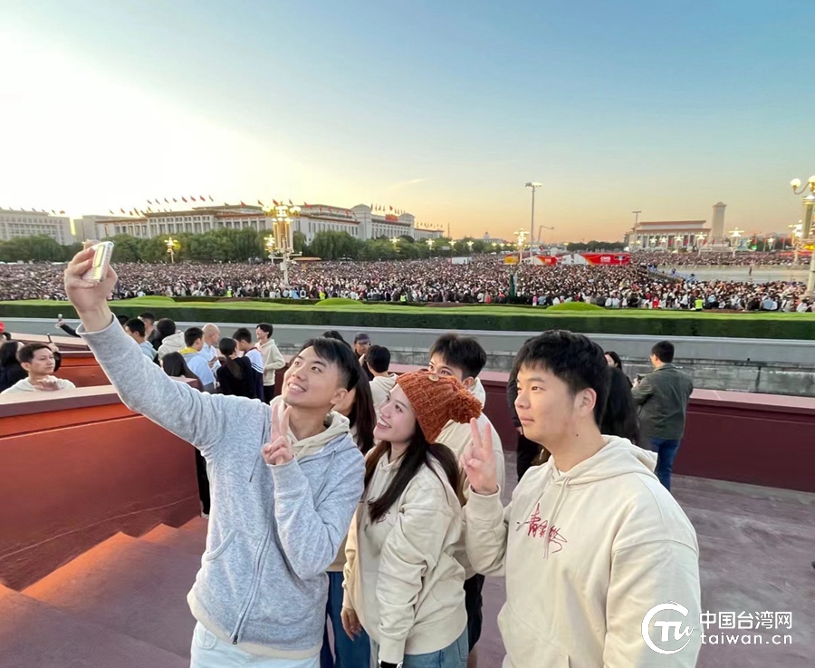 10月1日,來自北京、上海、廣州、福建等地高校的44名臺灣學生來到北京天安門城樓東側觀禮臺觀看升旗儀式。(林家緯 供圖,台灣網 發)