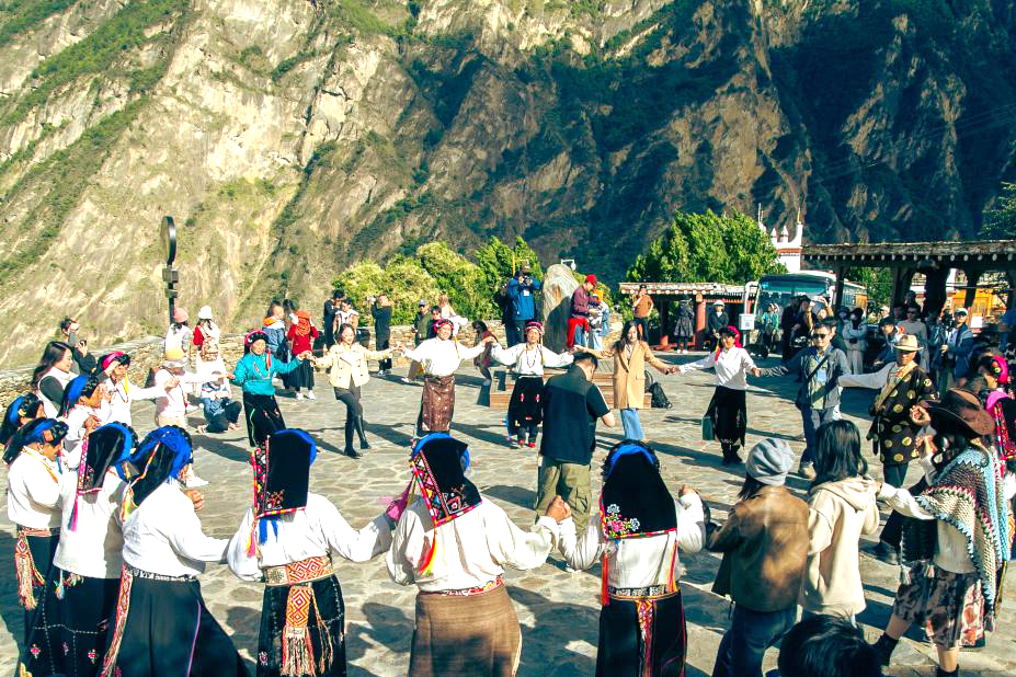 隨後,在丹巴的一處廣場上傳來了藏族傳統歌曲的聲音,當地藏民朋友圍在一起跳起了傳統舞蹈“鍋莊舞”,部分臺生以及臺灣自媒體朋友也按捺不住加入到了舞蹈的行列中,形成了兩岸一家親的美好畫卷。