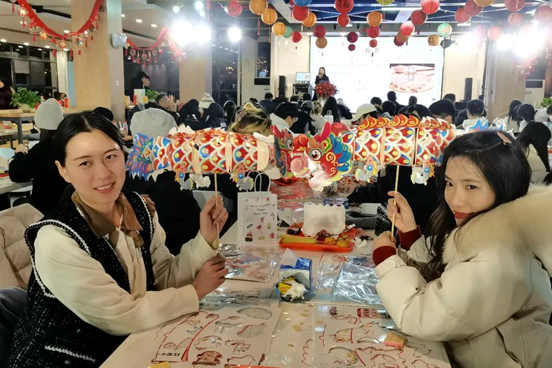 湖北孝感美珈職業學院、富邦華一、緯創軟體、力翰教育等臺資企業現場推介實習就業崗位。除了臺生歌曲精彩表演外,主辦方還準備了豐富遊戲和禮品,臺生臺師一起吃餃子、做龍燈、品冰糖葫蘆等,共話鄂臺情緣,讓臺青們感受到家的溫暖。