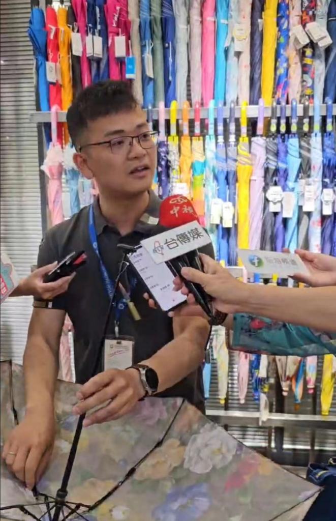 中國集成控股有限公司國內市場總監 張百潤介紹其超輕超貴的洋晴傘,採碳纖維及防曬日本鲜艷布,70公克,699元人民幣市場零售,得成都、重慶熱銷商品(圖 視頻 張玉鳳)