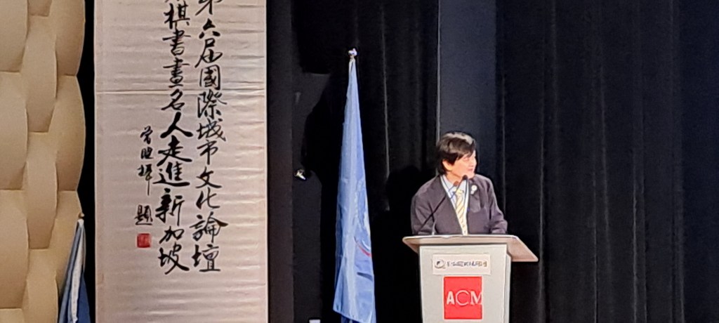 受邀演講包括組委會主席曾曉輝(上图),以15年來中華時報到近年AI加入傳媒分享、其他6位嘉賓包括,中國音樂藝術家高翔教授、領飛智能總裁方律、人工智慧語言教育協會會長蔡志禮博士(高祥代理上場)、當代藝術研究會副會長陳軍榮、新加坡理工大學席宏偉博士、新加坡作家協會副會長周德成等。