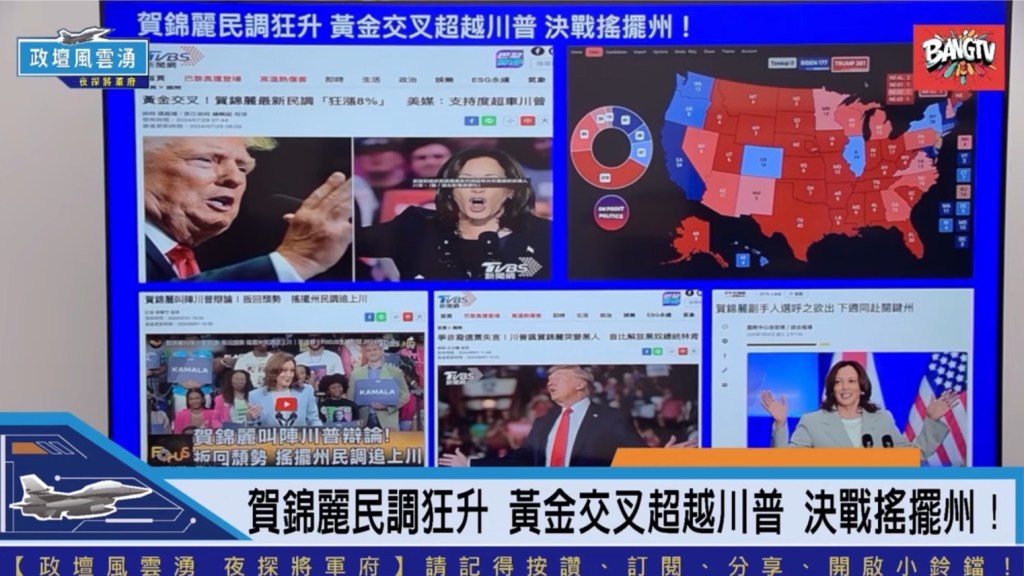 國際局勢則涵蓋美國大選,張博士他個人認為,共和黨的川普仍領先民主黨的賀錦麗,而在民調顯示賀錦麗狂升,認為是一時的新聞造成,觀察目前各州的領先仍以川普佔多數(上圖 紅色部分),而賀錦麗的領先區(上圖 藍色)仍在下風,而不同的顏色是搖擺州才是美國大選致勝的關鍵點。(圖擷自直播。)
