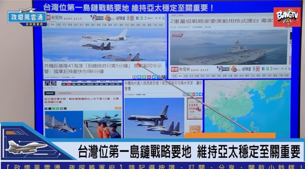 BANG TV製播節目「政壇風雲湧 夜探將軍府」第五集於今(2)晚8:00播出,由張延廷將軍主持,主題涵蓋國內政壇風雲、兩岸關係、國際局勢和航太動態。張將軍直批公帑支付台劇「零日攻擊」誇大不實,搞台灣內部分裂,而國防部長顧立雄對共軍圍台只作罐頭口號護台,拿不出實際的作為,對美軍遲不交軍售武器,建議要採信用狀購買,才能拿到護台到貨武器裝備。