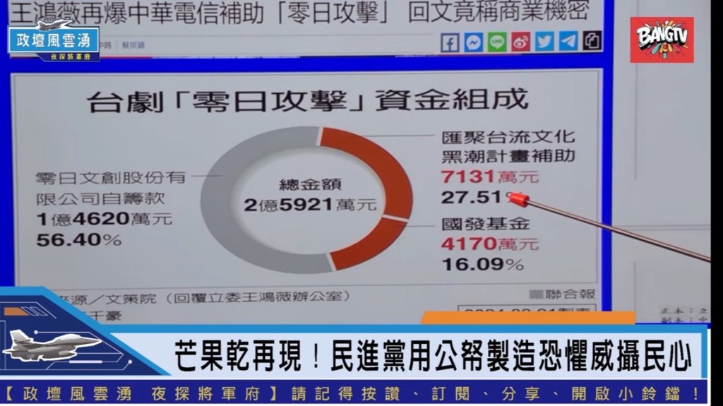 張將軍對於本週最熱的內政議題,是王鴻薇對由曹興誠投資拍攝的台劇「零日攻擊」揭發內幕,其2.6億資金一半的來自政府,但究其內容竟是如阿亮所言「沈伯洋的幻想台灣」背離事實,資金來自中華電信、國發基金,是屬國家、社會、股東的財產,用他們來分化台灣搞對立,是民進黨的政治對立,以一黨之私,用來要選票,搞鈔票的用途,對不起辛苦的年青朋友,把錢用錯地方。
