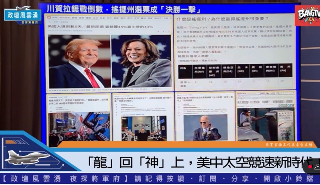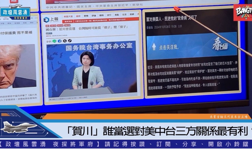 再過四天美國大選將開票,張延廷分析評論川普與賀錦麗對台政策的差異,並指出誰當選後對台灣的戰略影響有利。對於美中台關係上,特別提到台灣如何在美中之間保持平衡。大陸官媒「看台海」特別評論到美國大選,以國台辦發言人朱鳳蓮發言人警告台獨分子,「台灣是美國的棋子,隨時會變成棄子」。張將軍提問來賓,那大陸希望誰當選呢?