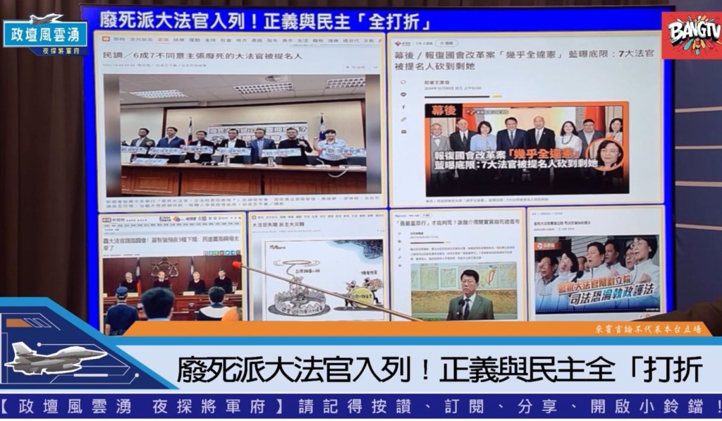 《政壇風雲湧 夜探將軍府》昨(1)天晚上八時播出第18集,節目主持人張延廷邀請政治評論員胡文琦先生當來賓,討論七位遞補任期屆滿大法官提名必被否決,不符反對廢死主流民意。美國大選如川普勝,台灣被視為是中美交易的籌碼,小心成為美國的棄子。