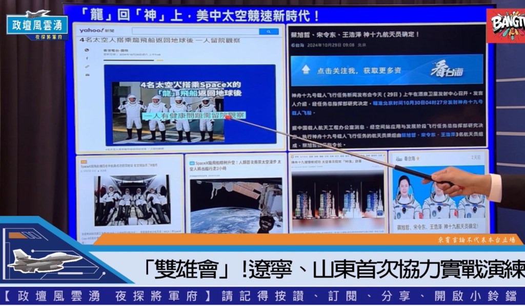 對中美太空競爭的動態,針對中國大陸神舟19號升空與SpaceX龍飛船返航,分析太空探索的競爭對兩國科技發展比較,張將軍認為中共在1996年被美GPS被鎖定後,自行發展北斗七星,過去1970東方紅升空,但美國1969即登月,現在已慢慢拉近到中共登陸月球背面取下樣本,到上月底神州19與18的太空倉,太空對接換人駐倉的科技,是讓美國吃驚,甩下俄國,形成美中兩國太空競爭的局面。胡文琦補充,我們雖小也可以從某個太空領域的系統著手,大陸事實擺有眼前,我們也不能無視他們的太空發展。