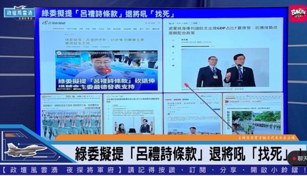 《政壇風雲湧 夜探將軍府》 第二十一集今(2 2)晚由主持人張延廷將軍邀請淡江大學戰略所教授許衍華,針對近期國際與兩岸多項重大議題進行深入探討與評論。張延廷強調「呂禮詩條款」一但通過,國軍目前缺額5萬人,「呂禮詩條款」限制退役軍人言論自由,志願役軍士兵入伍招生,恐雪上加霜。