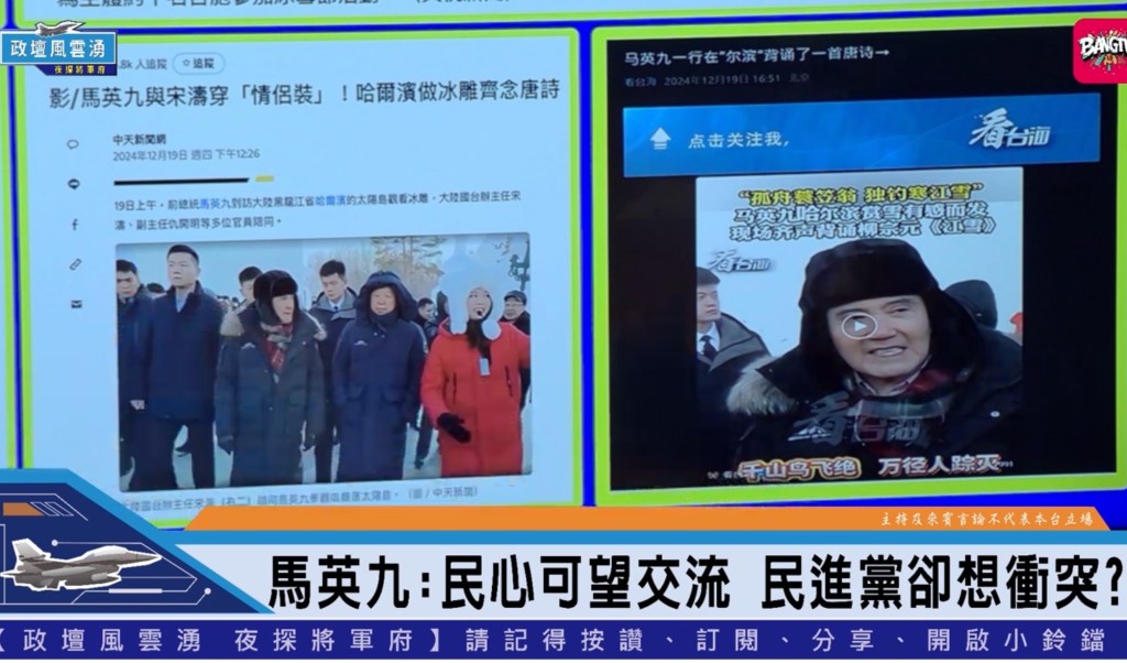 主持人張延廷為前總統馬英九率「大九學堂」學員前往哈爾濱,以「看台海」評馬前總統所說千山鳥飛絕,在零下14-18度冰凍嚴寒氣候,不辭辛苦所謂何來。