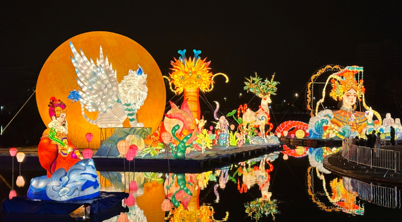 紅光湖的中央,三組超大型燈組「七下西洋」「瑯岐生明月兩馬共此時」和「國泰民安」依序排開,組成一幅長達150公尺的水上燈光畫卷。劉華攝