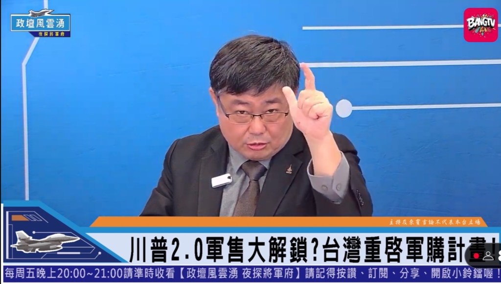張延廷將軍主持《政壇風雲湧 夜探將軍府》直播節目,於每周五晚上八點在YouTube上的BangTV頻道播出(第31集)請點擊下方連結觀看