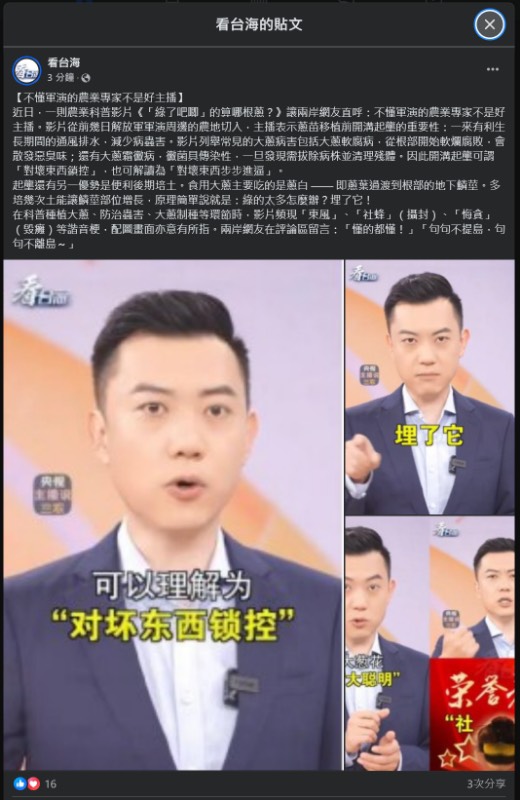 陸媒「看台海」臉書官網,今(5)天下午PO文農業科普影片,以《「綠了吧唧」的算哪根蔥?》(意含就是綠的不好看 綠的很差 就是貶抑詞 在這裡隱射民進黨)。讓兩岸網友驚嘆,不懂軍演的農業記者當不好主播。影片是依「海峽雷霆-2025A」及軍演台灣周邊科目,切入養蔥成栽過程,過程包括攝封、毀癱、對壞東西鎖控。